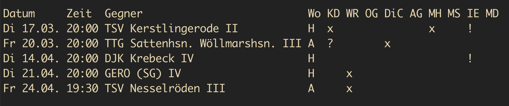 - m = möchte gerne bei dieser Begegnung spielen